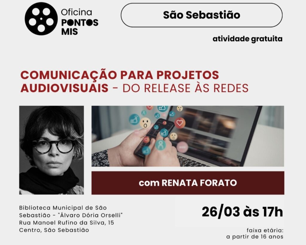 A Fundação Educacional e Cultural Deodato Sant’Anna, FUNDASS, em parceria com o Pontos MIS, realiza em São Sebastião a Oficina ‘Pontos MIS – Comunicação para Projetos Audiovisuais: do Release às Redes’, com a jornalista e comunicadora Renata Forato. A atividade é gratuita, voltada aos participantes a partir de 16 anos, e ocorre no dia 26 de março, às […]