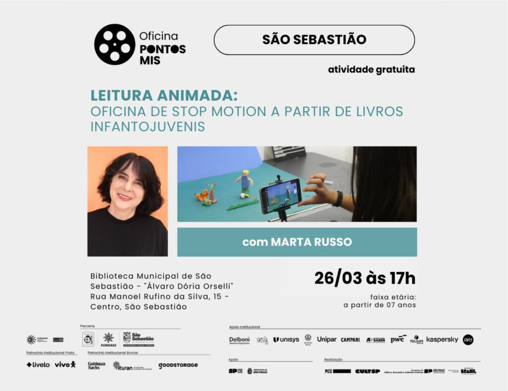São Sebastião recebe, no dia 26 de março, quarta-feira, a oficina “Leitura Animada: Oficina de Stop Motion a partir de livros infantojuvenis”, promovida pelo programa Museu da Imagem e do Som de São Paulo por meio do projeto Pontos MIS. A atividade será realizada das 17h às 21h na Biblioteca Municipal de São Sebastião “Álvaro Dória Orselli”, localizada na Rua Manoel Rufino da Silva, 15, no Centro, com 20 vagas disponíveis para participantes a partir de 7 anos.